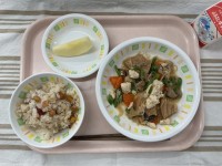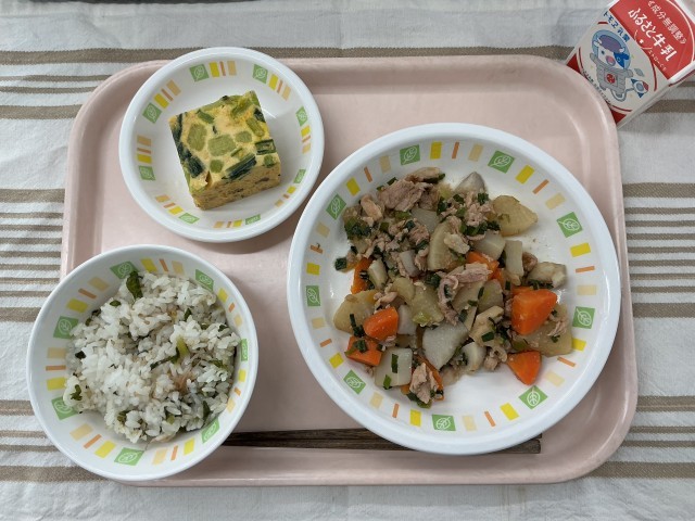 大根菜めし 千草たまご焼き 大根と豚肉の甘辛煮 牛乳
