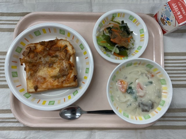 ピザトースト ホワイトシチュー わかめサラダ 牛乳