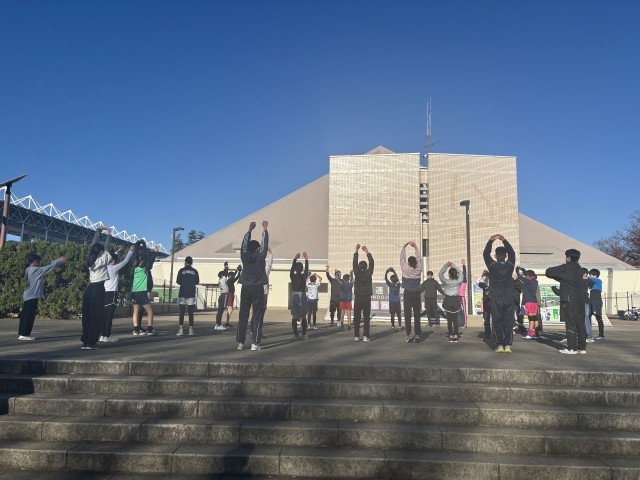 選手たちは朝早くから集合し、準備運動やウォーミングアップを行いました。