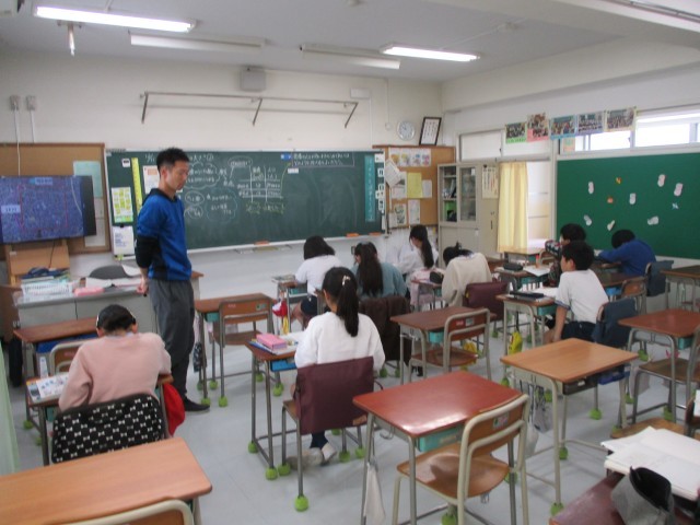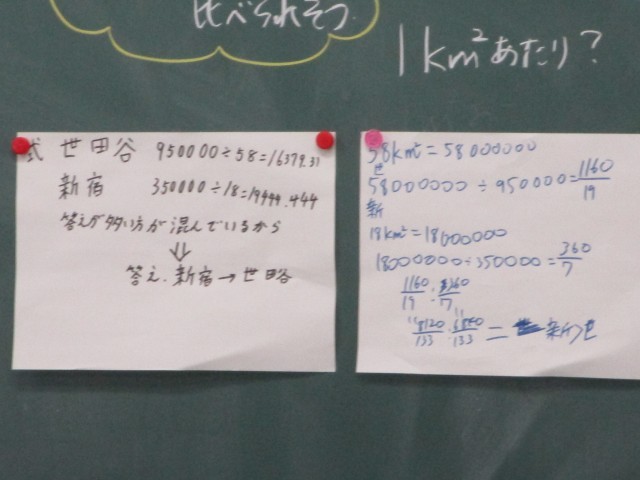 なかなか難しい単元ですが、世田谷区と新宿区の人口と面積の表を見ながら、「1㎢あたりの人口」と「1人あたりの面積」を求めて比べる学習にみんな意欲的に取り組んでいました。