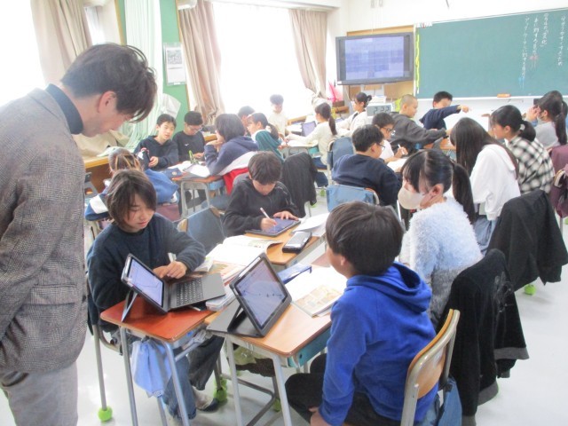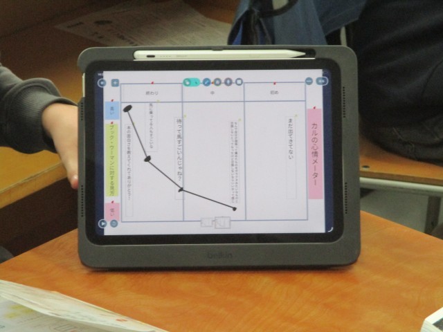 今日は物語を読んで登場人物の心情の変化をタブレットに入力しながら、友達と話し合う学習を行っていました。