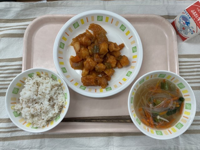 ごまごはん 鱈の甘酢あんかけ 春雨スープ 牛乳