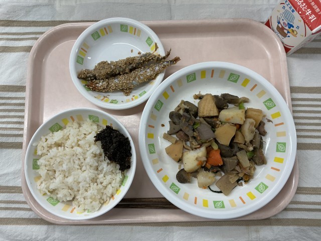 胚芽米ごはん 海苔のつくだ煮 シシャモのごま焼き 筑前煮 牛乳
