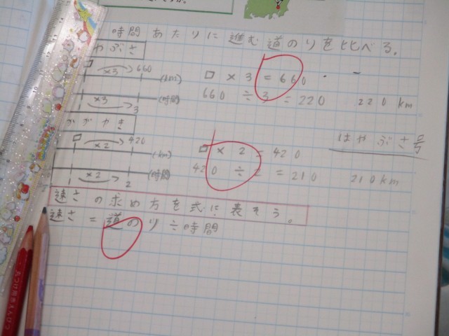 今日は3時間で660km進む新幹線と、2時間で420km進む新幹線のどちらが速いか1時間で進む距離(時速)を求める学習をしていました。