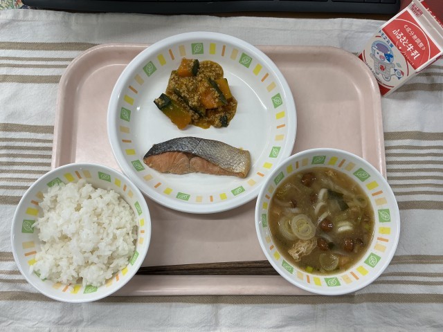 ごはん 鮭のゆず風味焼き 具だくさんみそ汁 かぼちゃのそぼろあん 牛乳