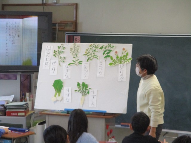 2年生の教室では教科「日本語」で春の七草について学習していました。