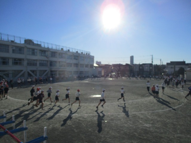 音楽に合わせて5分間、自分のペースで持久走をします。