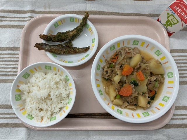ごはん シシャモの磯辺揚げ 肉じゃが煮 牛乳