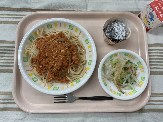 スパゲッティミートソース 大根サラダ 米粉のココアマフィン 牛乳