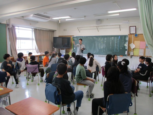 6年生の教室では、机を後ろに下げ、班で円になって国語の学習をしていました。