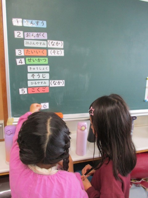2年生の教室では時間割マグネットを貼る当番がお仕事をしていました。