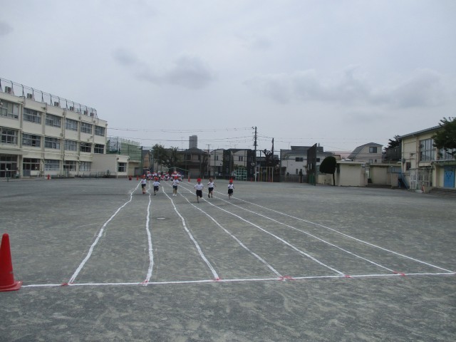 3時間目、1年生が体操着に着替えて校庭に出てきました。