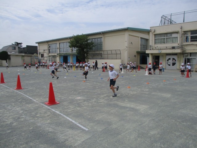 2年生は体ほぐしの運動遊びということで、校庭に2本引かれたラインの間をグループで走る活動をしていました。