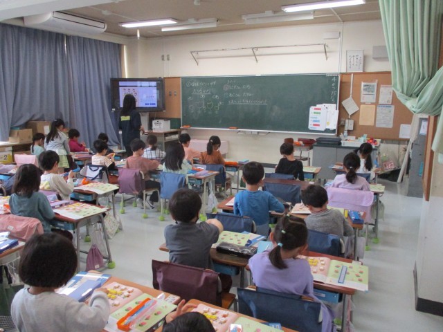 1年生の教室では算数ブロックを使って、数の大小の学習をしていました。