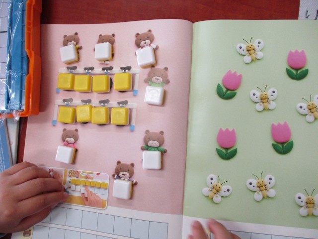 教科書のクマのイラストには白いブロック、一輪車の上には黄色のブロックを置いて、どちらが多いか学習していました。