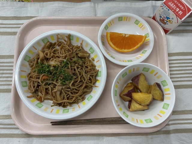 ソース焼きそば キャラメルポテト 清見オレンジ 牛乳