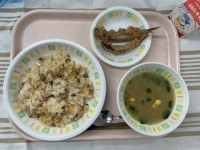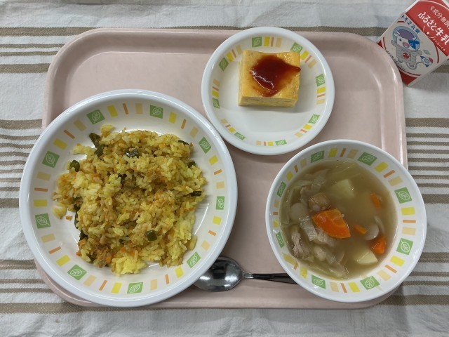 ツナカレーピラフ チーズ入りオムレツ 白いんげん豆の田舎風スープ 牛乳