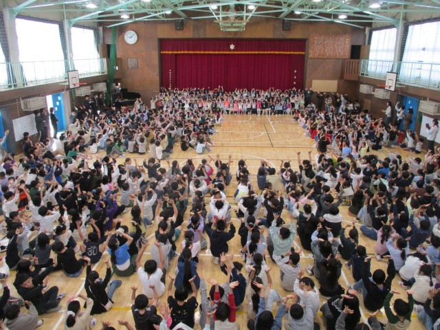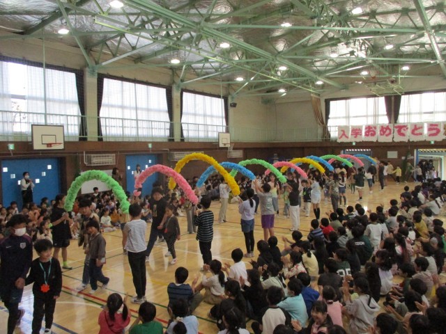 今日の1時間目、体育館に全校児童が集まり「1年生を迎える会」を行いました。