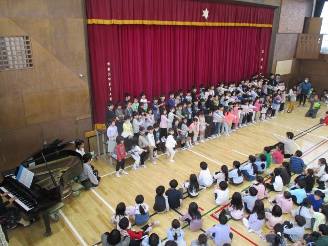 最初に6年生と手を繋ぎ入場し、3年生によるはじめの言葉、校長先生のお話、集会委員会によるゲーム、2年生からのアサガオの種のプレゼント、と会が進みました。最後に1年生から歌と言葉のお礼がありました。