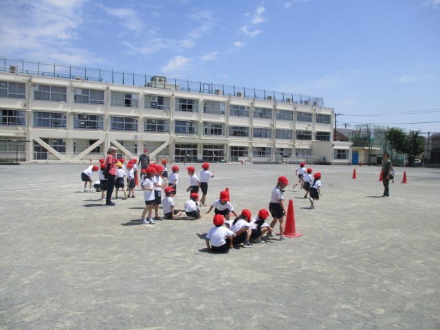 校庭では1年生が体育で走の運動遊びをしていました。