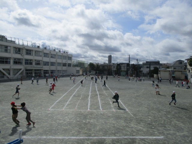 クラスで集合し、何をするか確認して広々とした校庭で体を動かし遊びました。