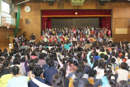 「世界中の子どもたちが」手話を交えて歌を全校児童の前で歌いました。