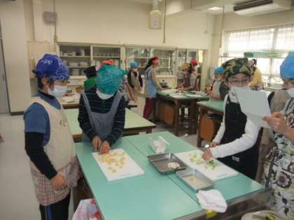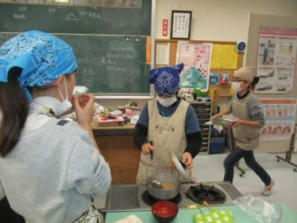 5年生が調理実習に取り組んでいます。「みそ汁」をつくっています。