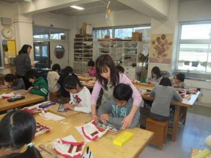 子どもたちです。集中して彫刻刀を使い分け木版画に取り組んでいました。
