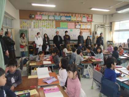 方々が参観に訪れました。教室に入りきれないで廊下で参観している方