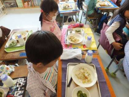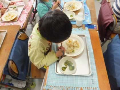 今日から給食が始まりました。幼稚園や保育園で給食を体験して
