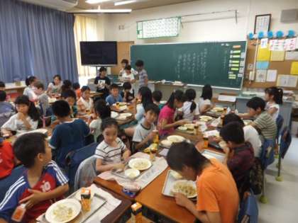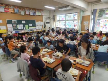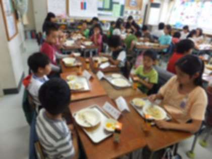 いきます。給食中にクイズや出し物をだして楽しく会食を進めていました。