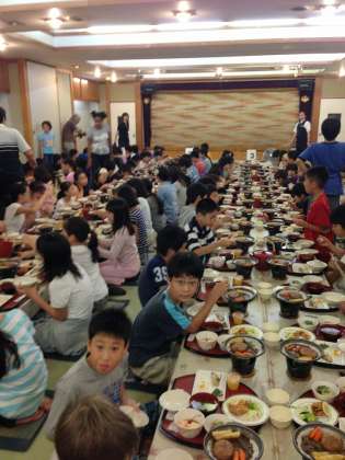 夕食の時間になりました。天気が良いので肝試しもできそうです。全員が元気ですので、全員が参加できます。それに備えて夕食をしっかりとっておきます。楽しい時間が流れています。明日も天気の心配はいらないみたいです。ハイキングもできそうです。