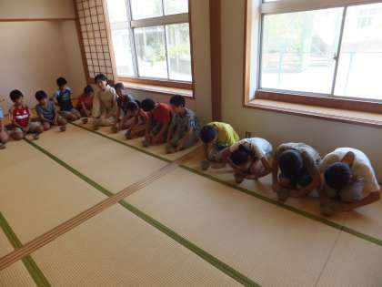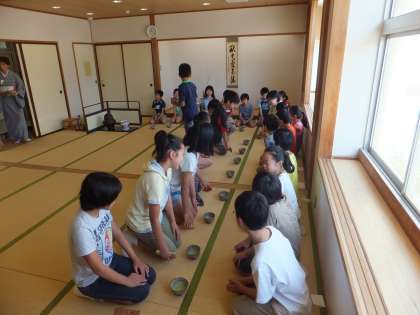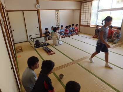 トップバッターは茶道です。畳のへりを踏まないとか、茶碗の出し方、礼儀作法などを学びました。日頃飲み慣れない抹茶は「おいしい」と言う子と「苦い」と顔をしかめる子が見られました。