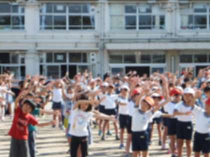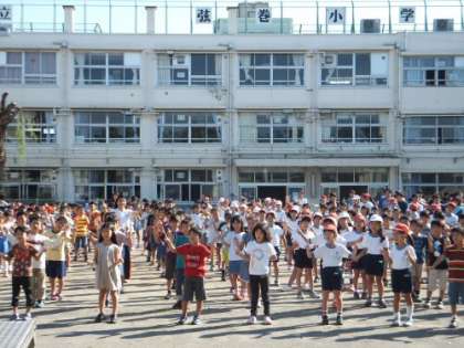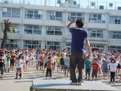 暑いくらいの晴天になりました。延びに延びていた体育朝会ができました。