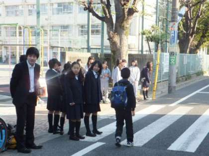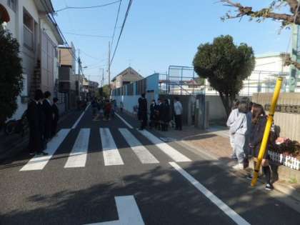 子どもたちと朝のあいさつで交歓しました。中には卒業生もいて