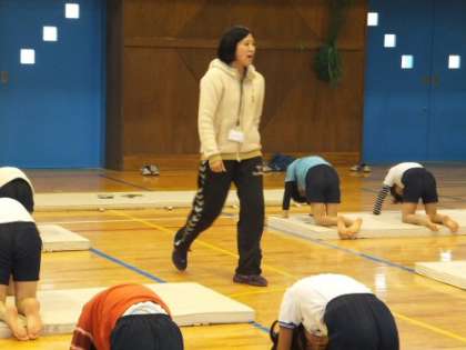今日の学習のマット運動に取り組んでいました。側転に挑戦です。