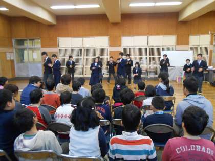 今日、弦巻中学校で、弦巻小6組と経堂小わかば学級、弦巻中学校の3校で交流会が行われました。中学生の司会のもと、会は進行されました。中学生によるAKBの「恋のホーチュンクッキー」の踊りや学校を舞台にした劇、3年生の修学旅行の発表があり、一生懸命さと、おかしさのある出し物に小学生も割れんばかりの拍手を送りました。