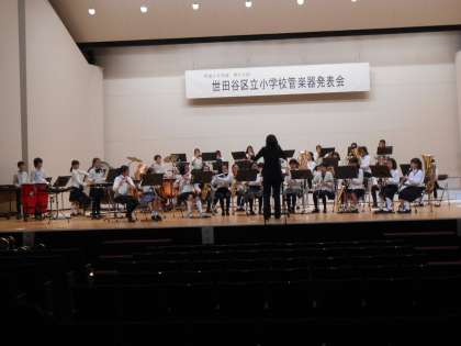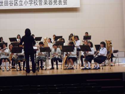 今日、世田谷区民会館で世田谷区内の小学校11校が集まって、午前午後に分かれ管楽器発表会がありました。弦巻小学校は、午後の部の最後から2番目に登場しました。今日は昨日の雪の影響で、開始が1時間遅れて始まりました。