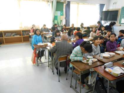 その後、2クラスに分かれていただき、給食を一緒に食べました。世田谷東町会の3人の方、お忙しいところありがとうございました。