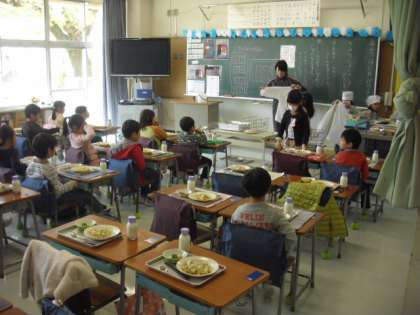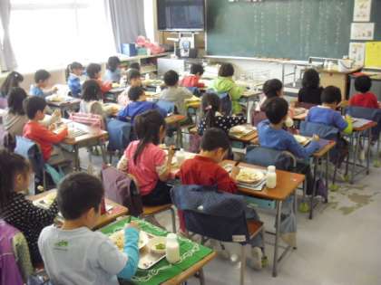 今日から、1年生の慣らし給食が始まりました。きちんと席に座り、呼ばれると給食を配膳してもらいにすばやく移動していました。「おいしい?」と聞くと「うん。おいしい」と言って、おかわりの列に加わっていました。1日目にしては、どのクラスも上手に給食の準備・配膳をしていました。たくさん食べる子どもたちに驚かされました。