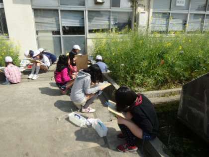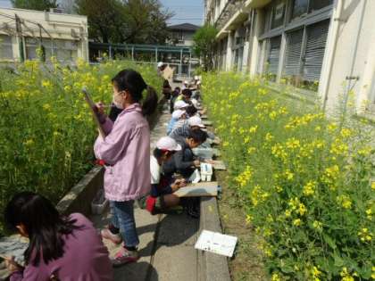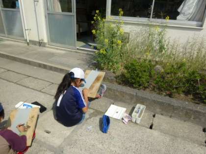職員室の前のアブラナの花もそろそろ終わりです。5年生が図工の時間に