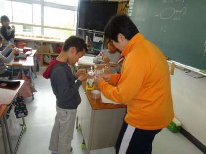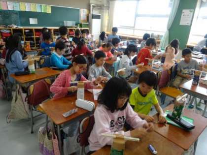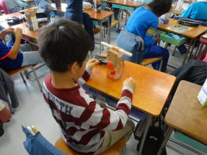 教室の中には、小さな物理学者がいっぱいいました。牛乳パック等の