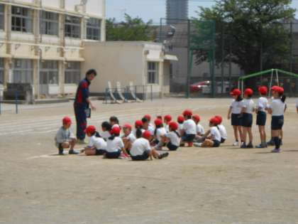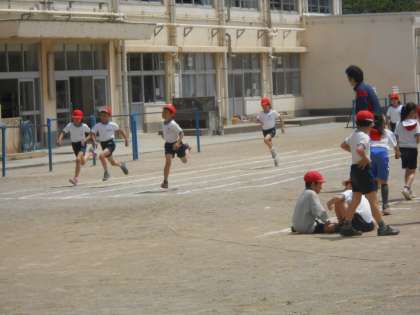 晴天のもと、3年生が徒競争の練習をしていました。順番に並び、走り終わったらしっかりしゃがんで待つことができていました。3年生のお兄さん・お姉さんになりましたね。走っている姿もたくましく感じました。