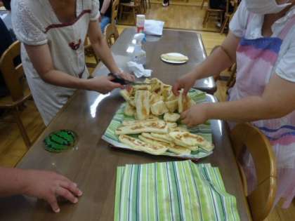 今日は、多くの保護者の方もいらしています。みんなで「ナン」作りを