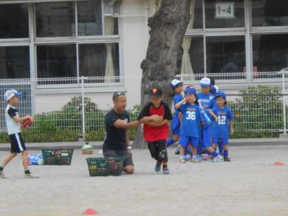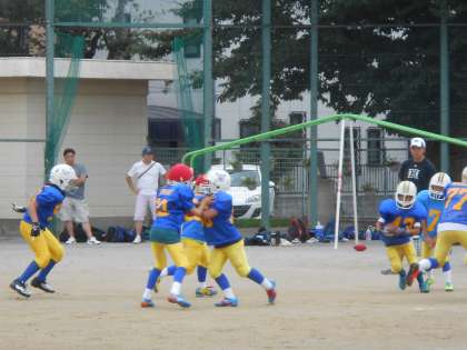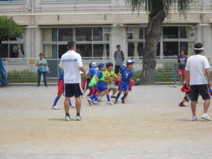 2日目、校庭では、今年初めて講座を開いていただきましたアメリカンフットボールチーム世田谷ブルーサンダースが『フラッグフットボール&アメフトクリニック』を開講してくださいました。アメフトは、野球やサッカーなどに比べると知られていないスポーツですが、アメリカではとても人気のあるスポーツです。パスされたボールを走りながらキャッチする練習や試合を楽しみました。