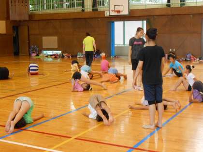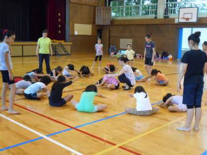 体育館では、「新体操にチャレンジ!」が行われました。色とりどりの衣装をつけた新体操部を中心に、参加者も新体操にチャレンジしました。
