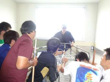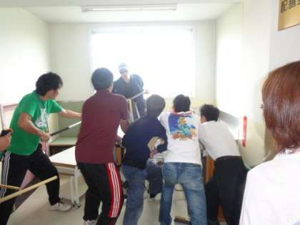全員参加です。不審者になった警察官の迫力に圧倒されながら不審者対策を