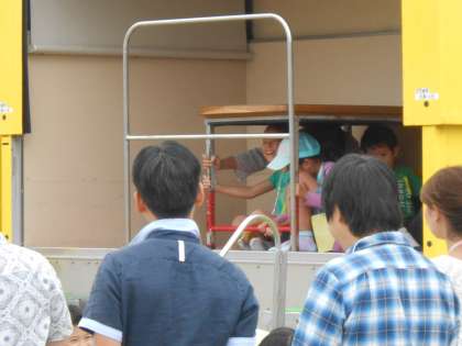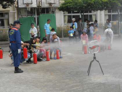 避難所運営訓練は、消火器を使った消火訓練、ナマズ号での震度6・7体験、マンホールトイレ見学を行いました。消火器の使い方簡単、低学年の子どもたちもチャレンジしました。またナマズ号では、机の下にもぐり、机の脚をしっかり持って揺れに耐えていました。またマンホールトイレの組み立て方、仕組み、実際に中に入ってる体験をしました。