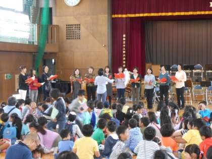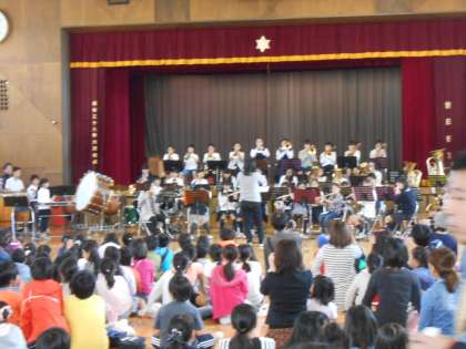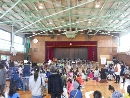 今日は、子どもたちが楽しみにしていた、遊び場開放祭りです。開会式に引き続き、体育館でコンサートが開かれました。PTAコーラス、弦巻小吹奏楽部の演奏です。
