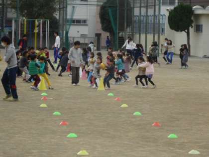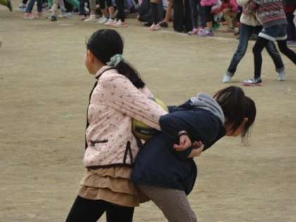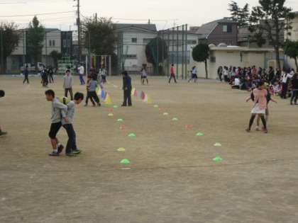 体育集会の内容は、「ボール運びリレー」でした。2人で一組となり